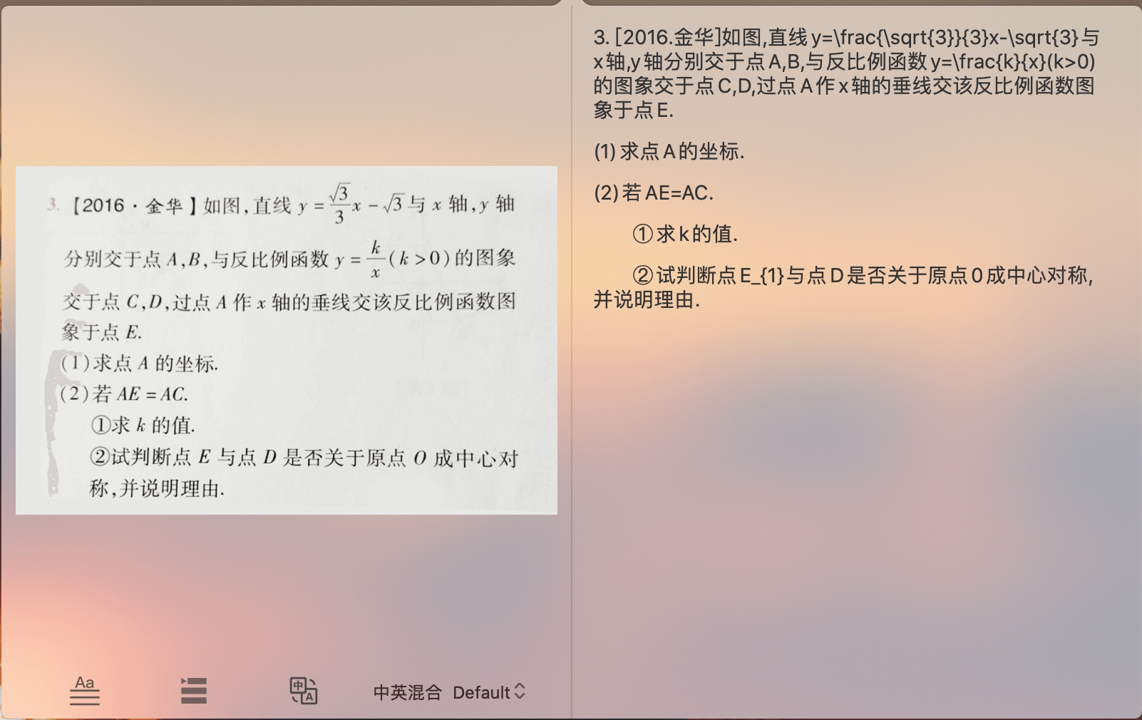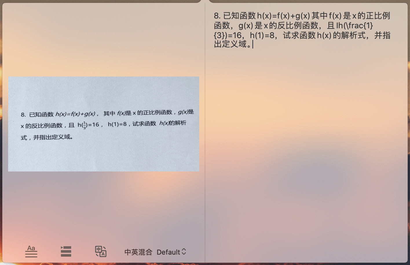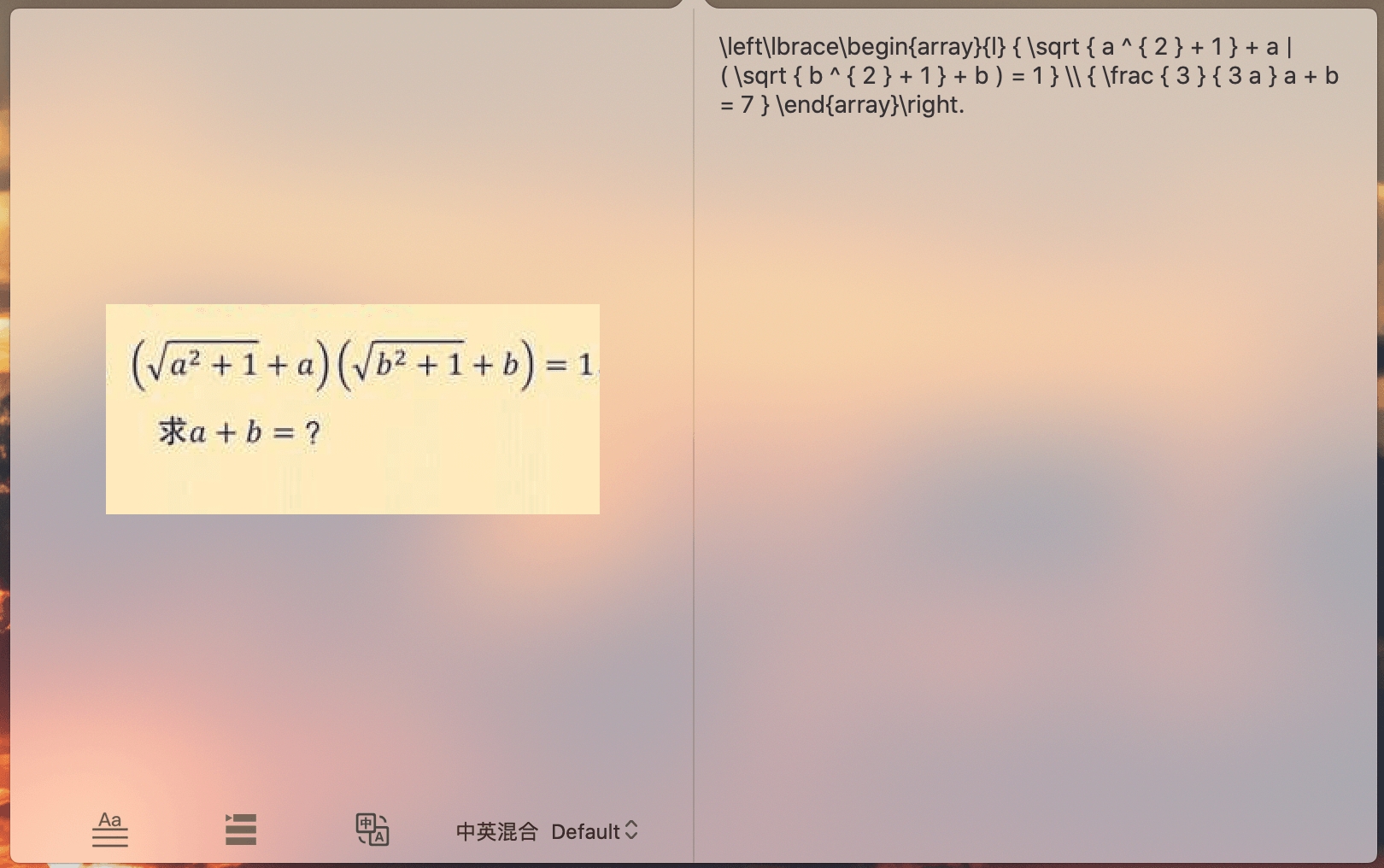 识别数学题目及数学公式,转化为LaTeX格式题目。
