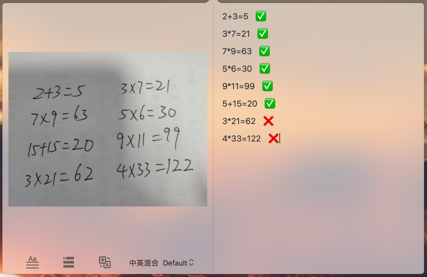 识别算术题,并智能批改结果,可代替手动批改作业,提高效率。